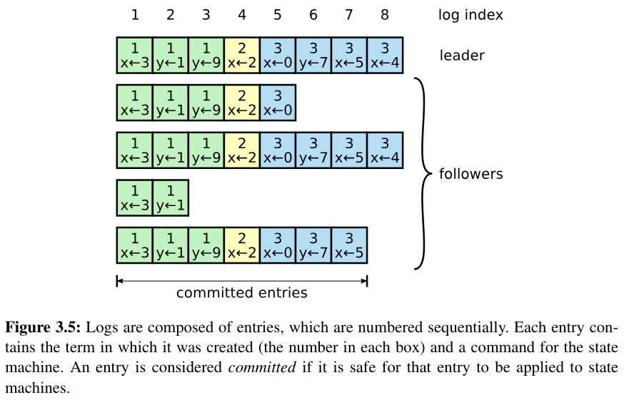 整个log的组织方式如下图所示,每条日志(log entry)都会有一个惟一id, 这个id由term和log index组成,其中term就是产生本条日志的,当期leader的term值。